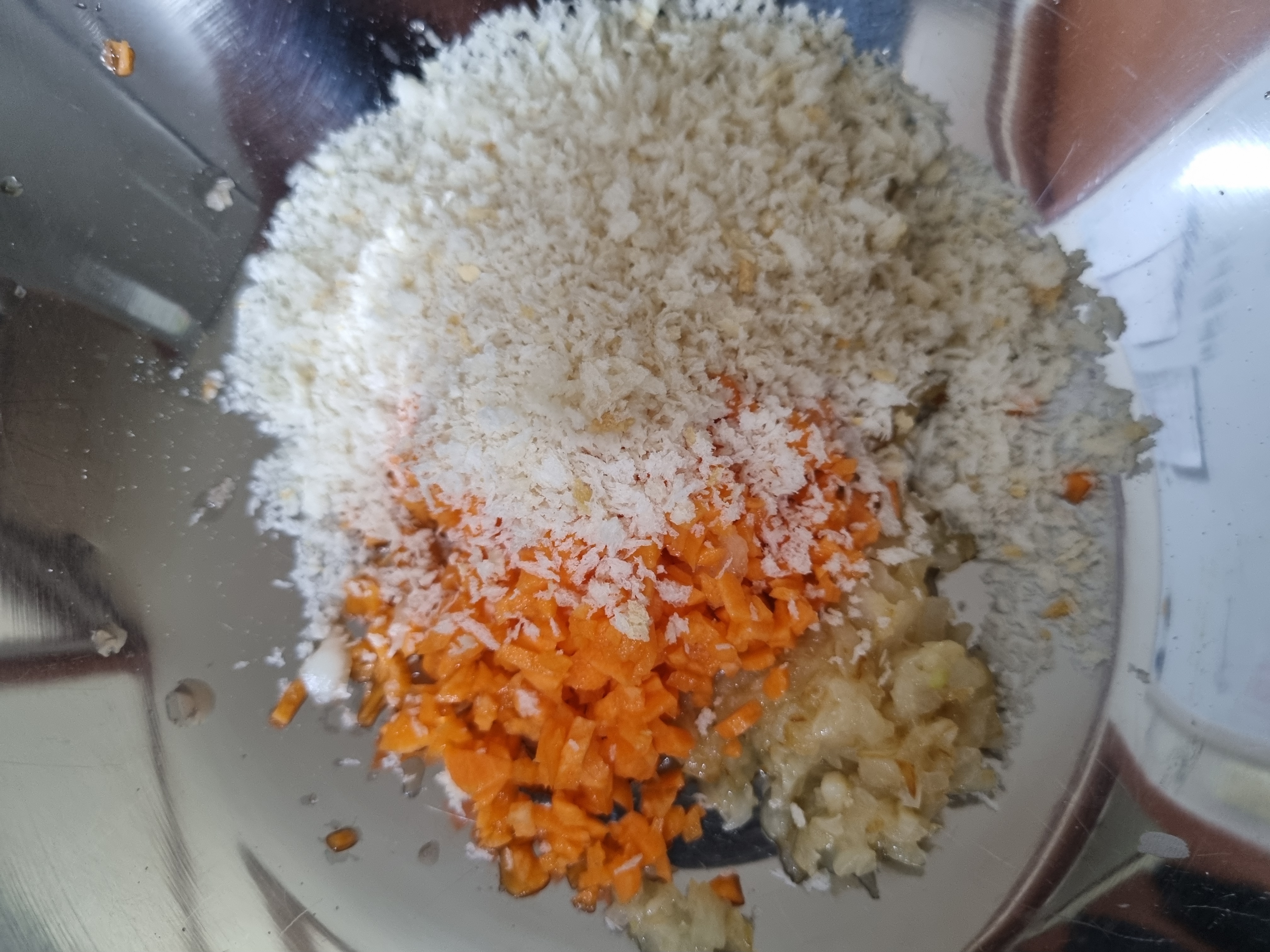 그리고 빵가루도 종이컵으로 반 컵 넣었어요. 사실 얼마나 넣어야 될지 잘 몰라요. 그냥 넣었어요. 원래 엄마의 야메요리는 계량을 잘 안 해요. 원래 엄마들은 그런 거예요.