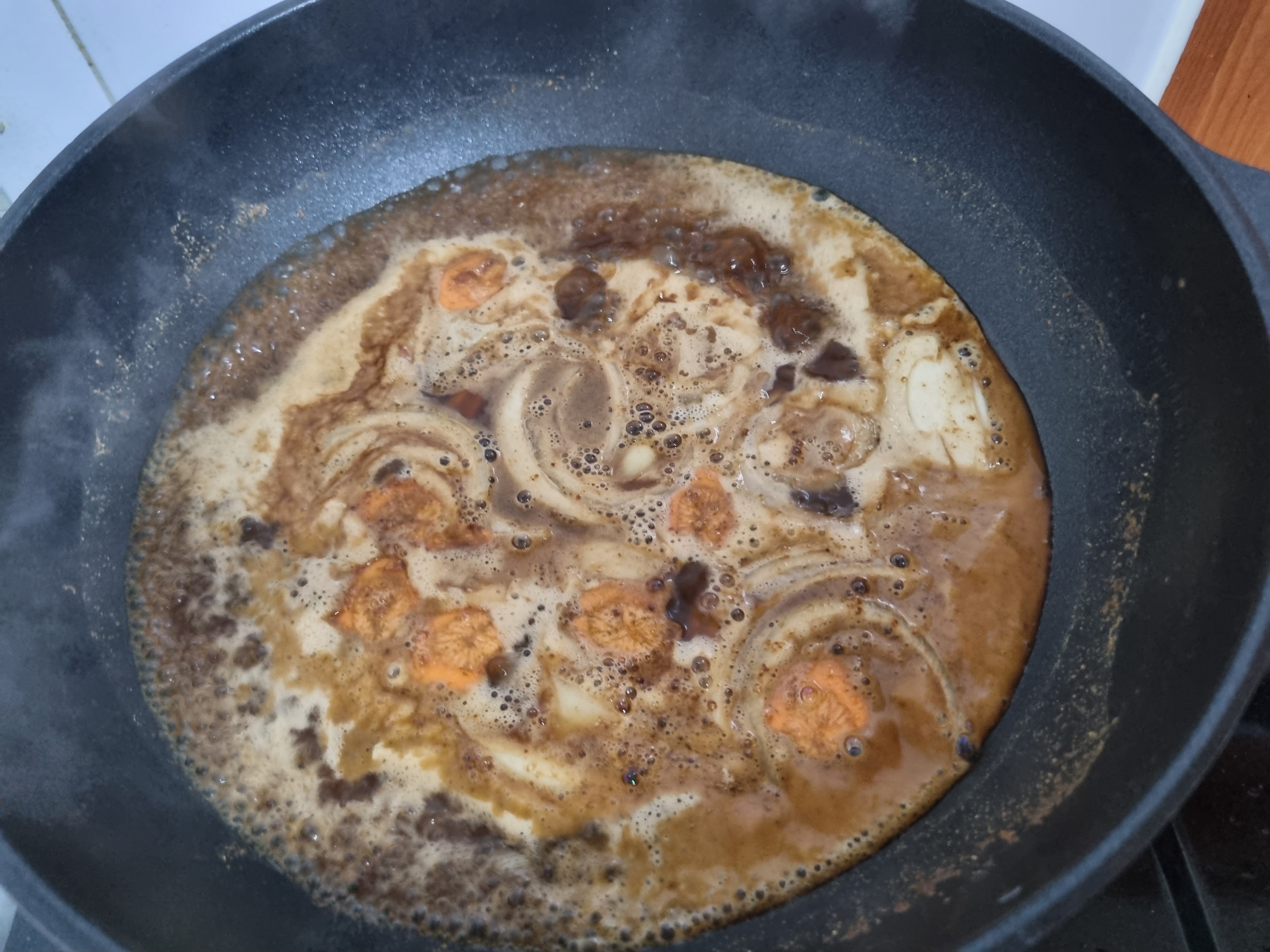 양파와 당근을 조금 넣고, 케첩도 한 바퀴 돌려서 뿌리고, 살짝 끓여요. 비주얼이 참.... ㄸ. 아무튼 함박스테이크 소스가 끓는 동안 함박스테이크를 만들어야 해요.