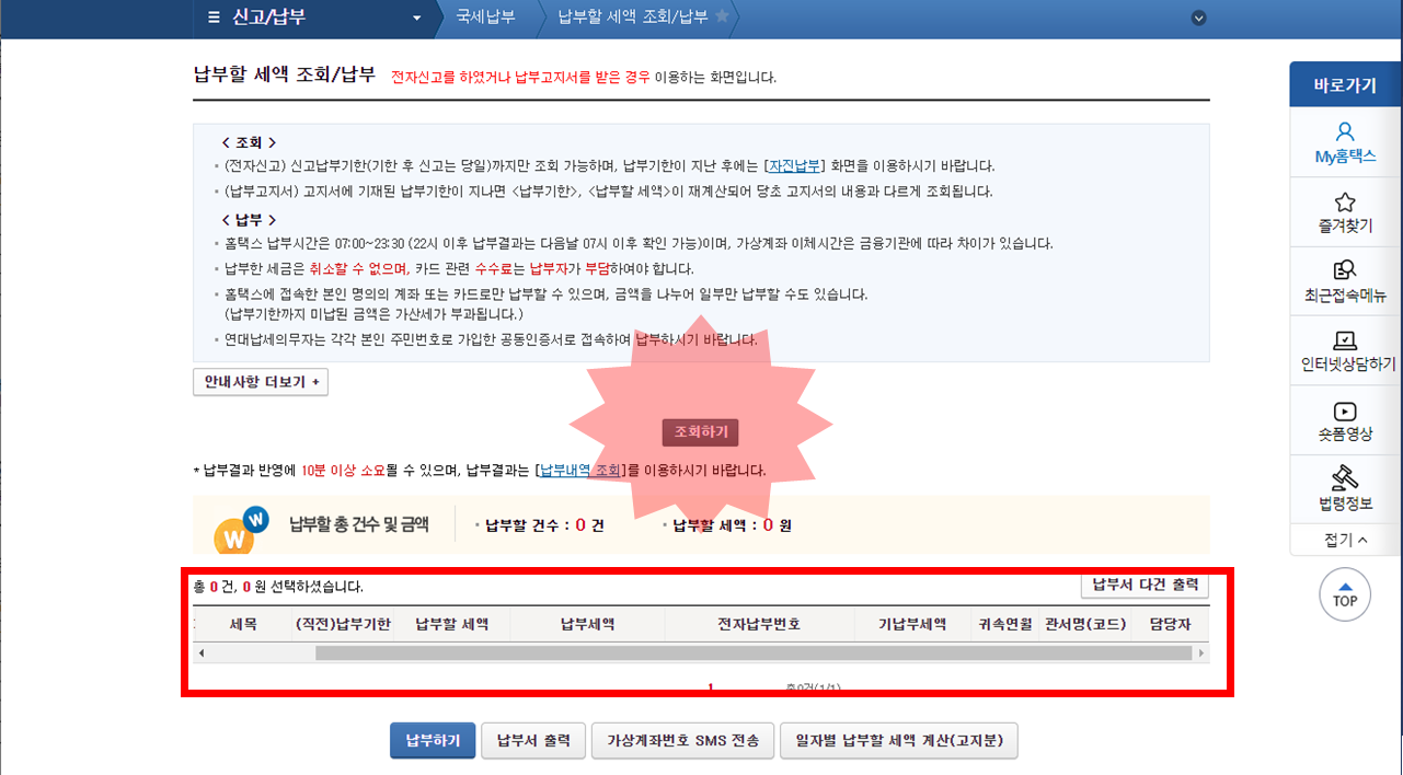 조회하기를 클릭하면 납부할 세액 목록에 아무것도 남아있지 않다. 드디어 끝났다.