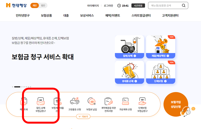 보험금 청구 방법은 홈페이지, 모바일, 우편, 방문으로 서류를 접수하고 청구할 수 있어요. 1,000만 원 이하만 모바일과 홈페이에서 신청이 가능해요. 필자는 현대해성 홈페이지에 들어가서 로그인을 했어요.